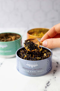Packed in a beautiful tea tin with the farmer's picture/profile, a hand-carved, olive-wood, Kenyan spoon, and a viewing window in the lid to see the beautiful loose leaf tea
